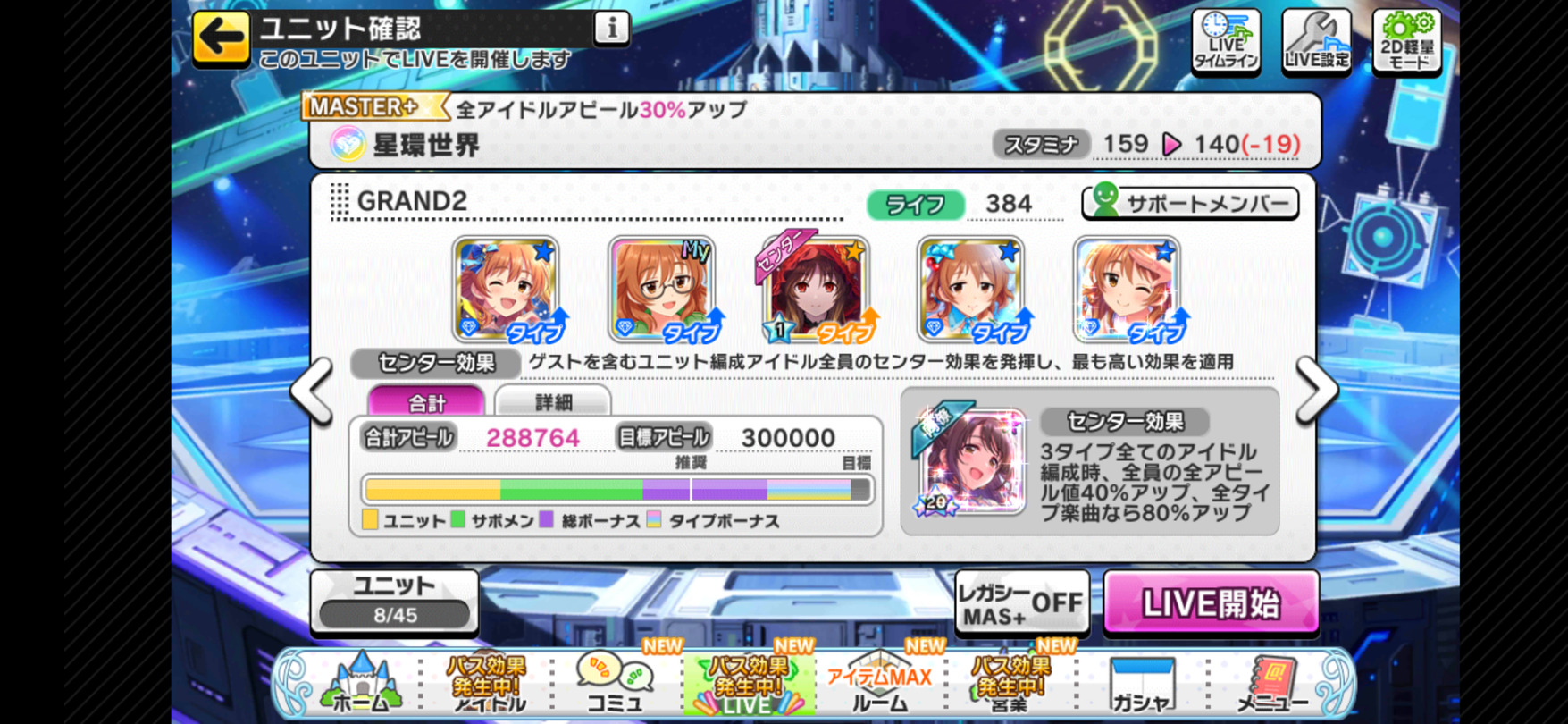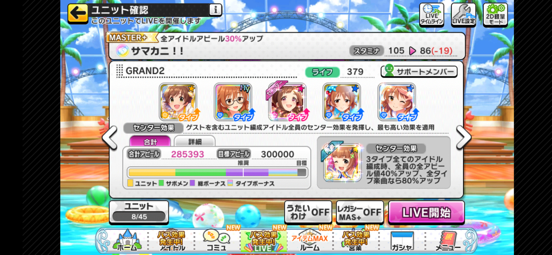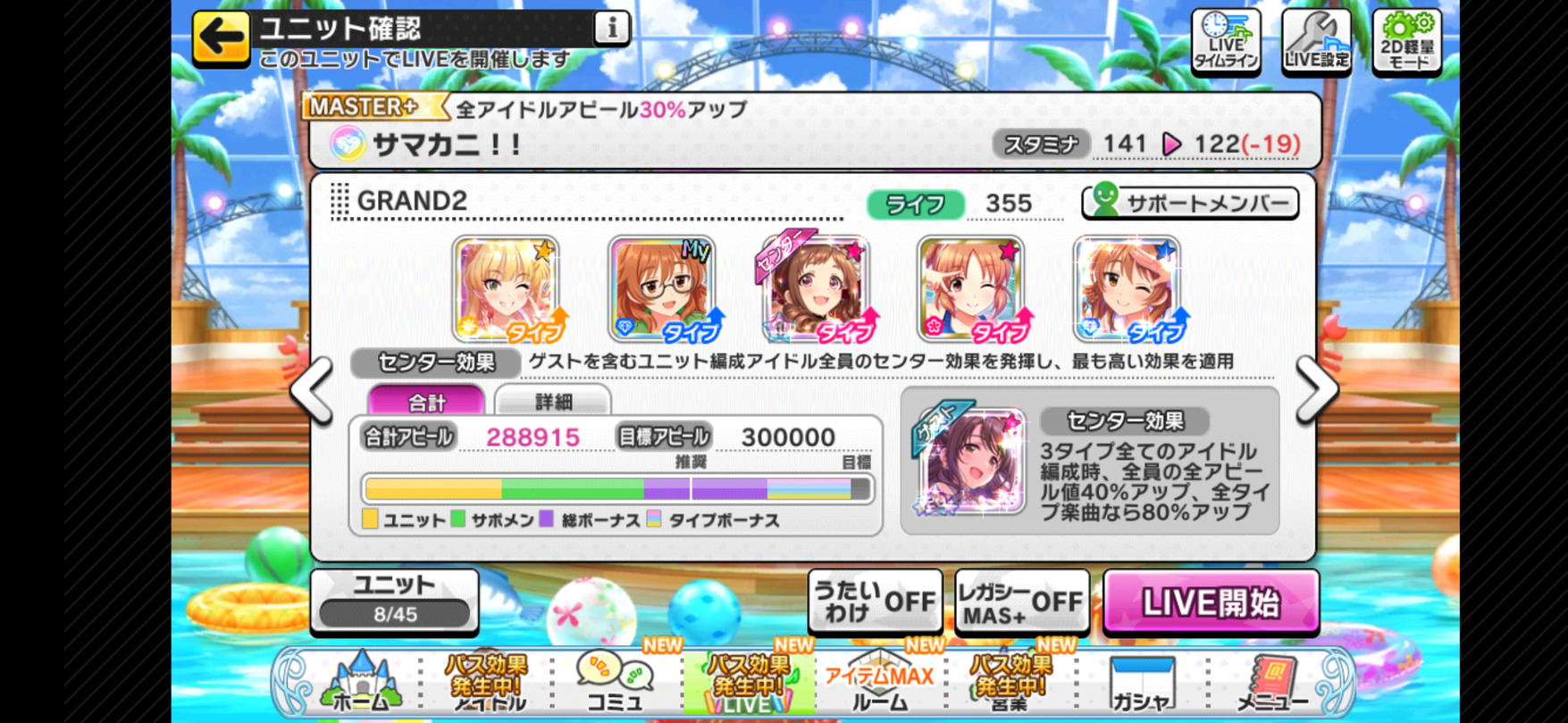 - 回せる曲はかなり限られる。ライフを370程度用意して、なお星環世界(mas+)固定?画像はサマカニだがサマカニだとライブ失敗する