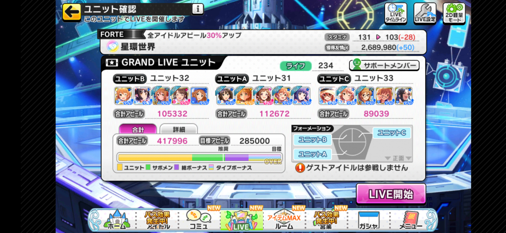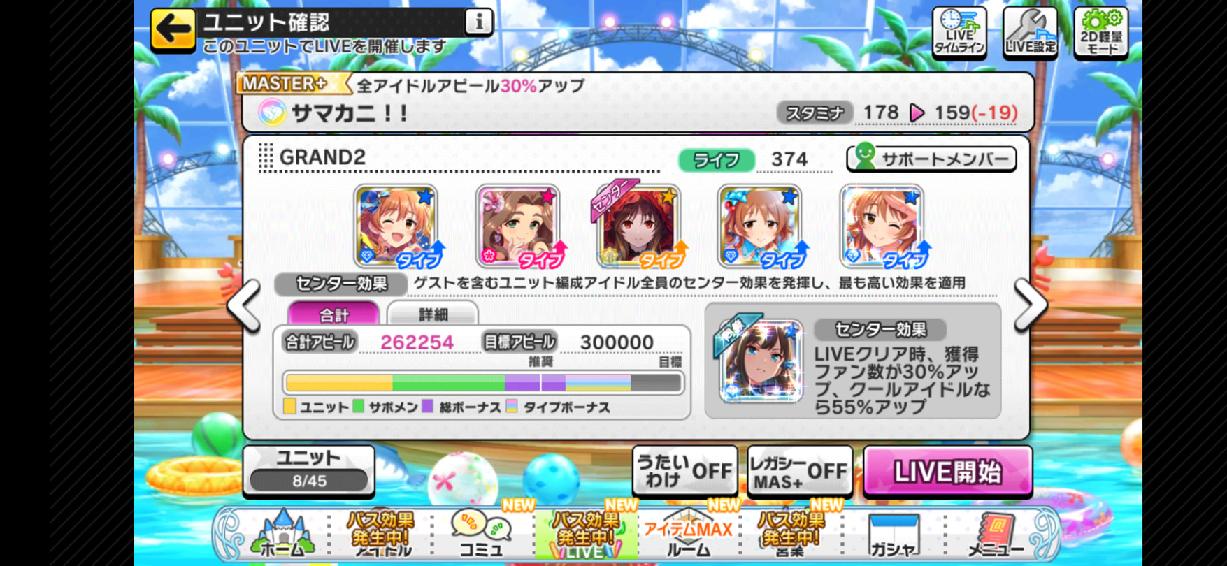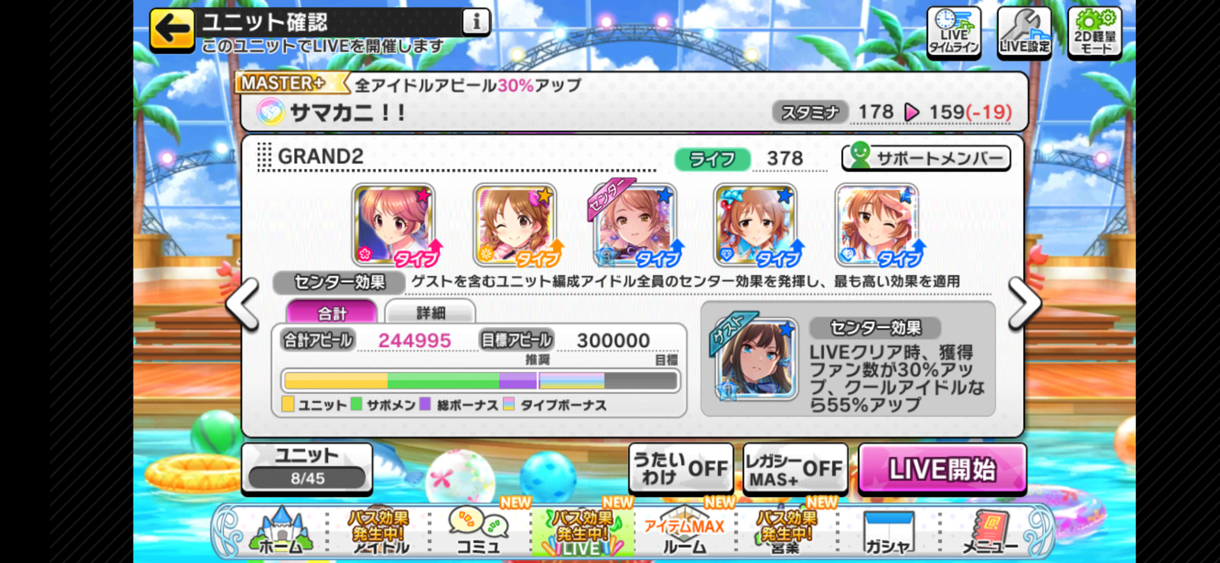 - 回せる曲はかなり限られる。ライフを370程度用意して、なお星環世界(mas+)固定?画像はサマカニだがサマカニだとライブ失敗する